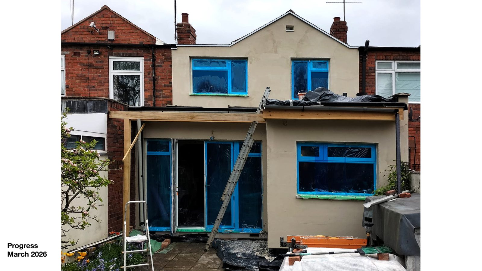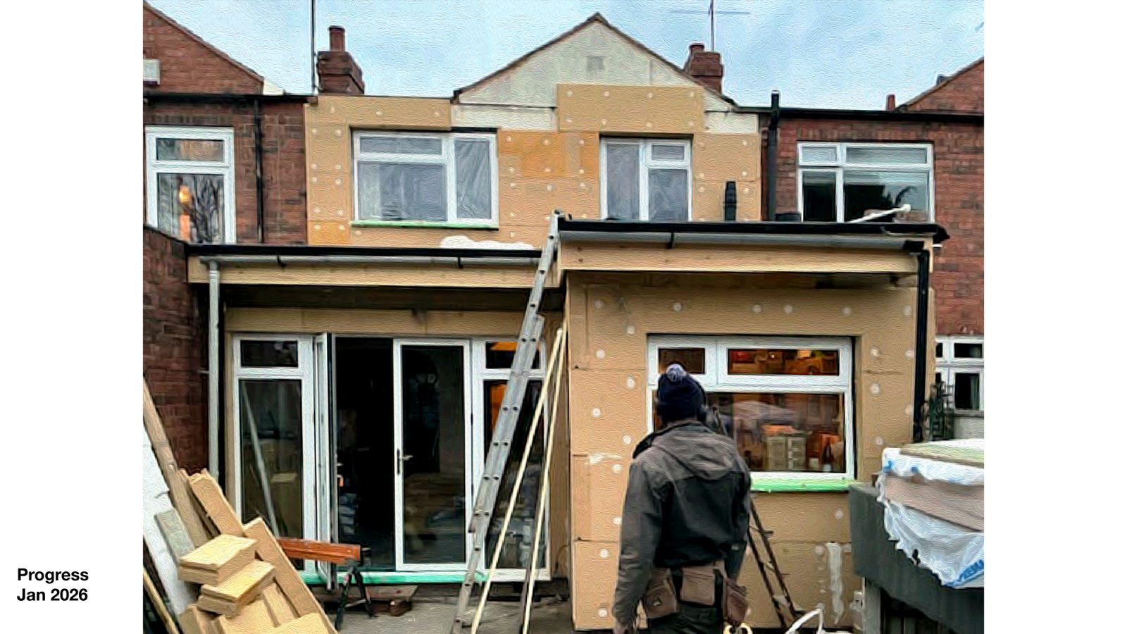 Brick Terrace Rear Extension - - Flat roof + External Wall Insulation (Wood Fibre), Oak Structure + Skylights + Glassed Canopy